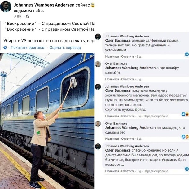 Журналіст з Данії Йоханнес Вамберг Андерсен, незадоволений брудним поїздом Київ-Ізмаїл, пасажиром якого він був, на одній із зупинок сам помив вікно поїзда. Про це іноземець повідомив на своїй сторінці у Facebook.