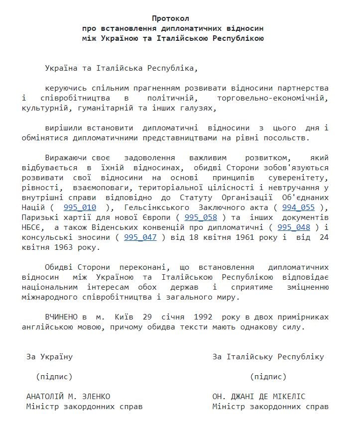 29 січня - особливий день для українсько-італійських відносин, адже саме у цей день у 1992 році було закладено міцний фундамент у взаєминах країн - підписано Протокол про встановлення дипломатичних відносин між Україною та Італійською Республікою.