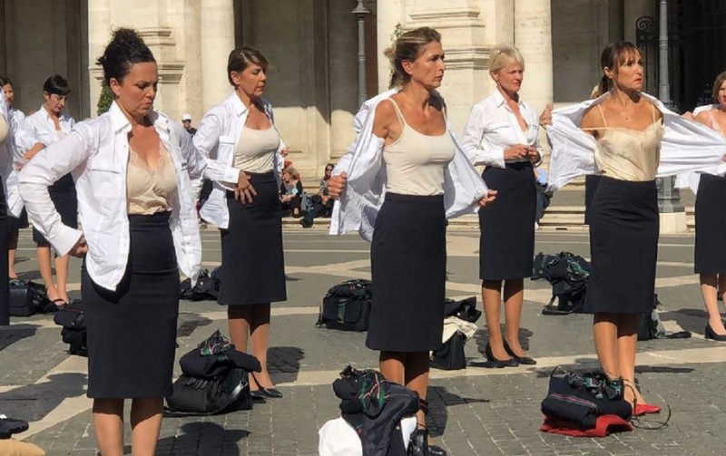 На опублікованих кадрах, близько 50 колишніх стюардес авіакомпанії Alitalia вишикувалися рядами на площі на вершині римського Капітолійського пагорба.