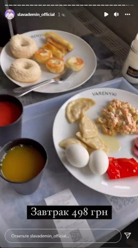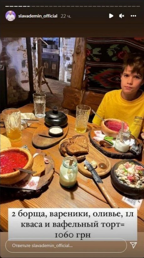 Популярний радіоведучий Слава Дьомін також поділився цінами на їжу. За дві порції борщу, вареники, олів'є, літр квасу та вафельний торт йому довелося заплатити 1060 грн.
